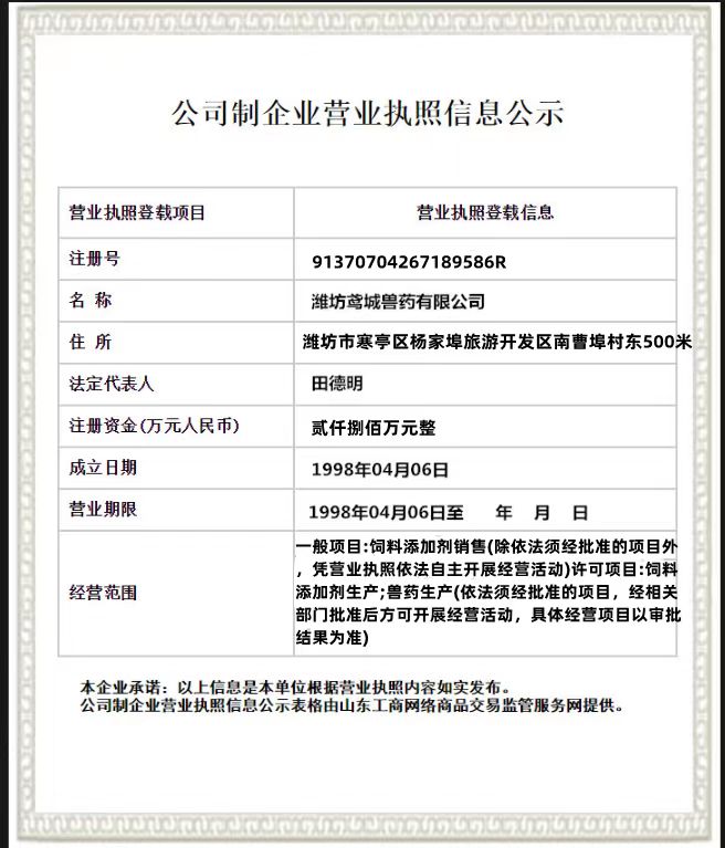 濰坊鳶城獸藥有限公司,創(chuàng)建于1987年,位于“世界風(fēng)箏之都”濰坊市寒亭區(qū),是山東省專(zhuān)業(yè)從事生產(chǎn)、銷(xiāo)售的重點(diǎn)獸藥企業(yè)。公司已順利通過(guò)農(nóng)業(yè)部獸藥GMP認(rèn)證,今后將繼續(xù)引進(jìn)高新技術(shù)開(kāi)發(fā)新產(chǎn)品,加快技術(shù)改造步伐。同時(shí),公司擁有強(qiáng)大的銷(xiāo)售隊(duì)伍和完善的銷(xiāo)售網(wǎng)絡(luò),因此,多年來(lái)被各級(jí)政府評(píng)為“先進(jìn)單位”、“AAA級(jí)信用企業(yè)”、“重合同、守信企業(yè)”。公司董事長(zhǎng)田德明先生攜鳶城獸藥全體員工熱烈歡迎廣大客戶(hù)來(lái)公司洽談業(yè)務(wù),我們?cè)敢詢(xún)?yōu)質(zhì)的產(chǎn)品、精美的包裝、合理的價(jià)格、周到的服務(wù)與各界朋友真誠(chéng)合作,共創(chuàng)畜牧業(yè)美好的明天。 ……